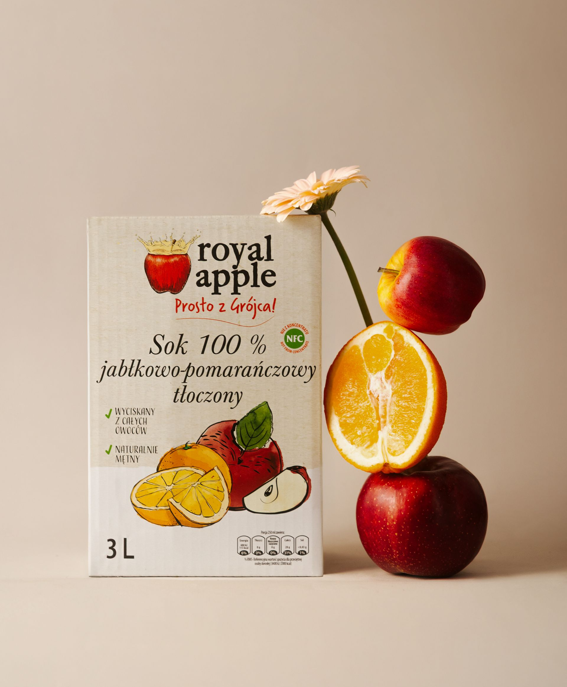 W Royal Apple nie dodajemy nic poza tym, co oferuje natura. Zero cukru, wody, konserwantów czy sztucznych dodatków. Nasze soki są świeże, tłoczone na małych partiach, byś mógł cieszyć się ich pełnią smaku i wartości każdego dnia.
